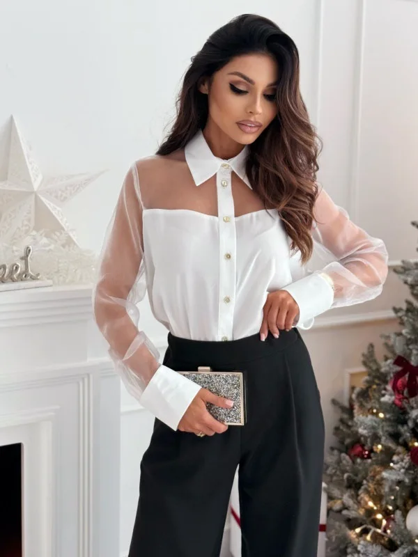 Shirt Top Women Sheer Patchwork Turn Down Collar Single Breasted Full Sleeve Blouses Tops Autumn 2025 Office Lady Overshirt