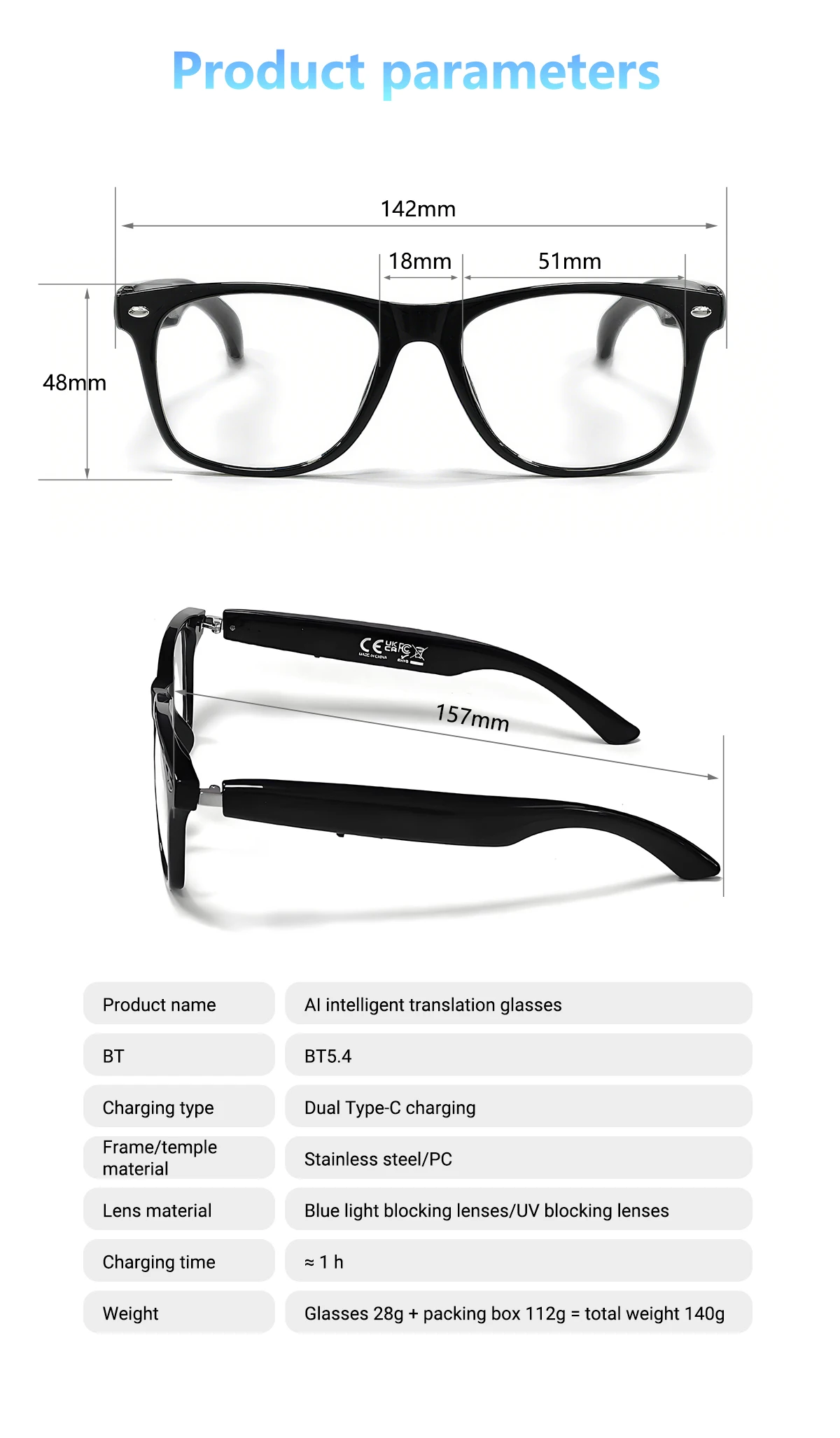 Functions: Bluetooth calling / music playback / voice assistant / remote photo / AI translation