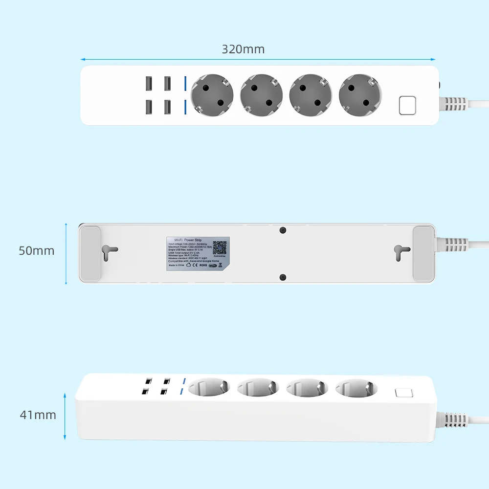 – Smart Power Strip with WiFi connectivity, compatible with Alexa and Google Assistant, featuring 4 AC outlets and 4 USB charging ports.