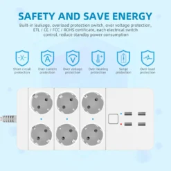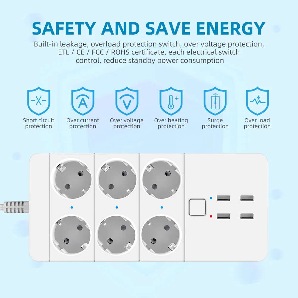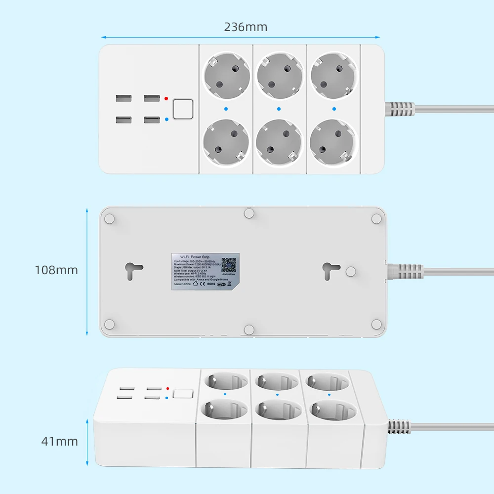 – Smart WiFi Power Strip with 6 AC outlets and 4 USB charging ports, compatible with Alexa and Google Home.