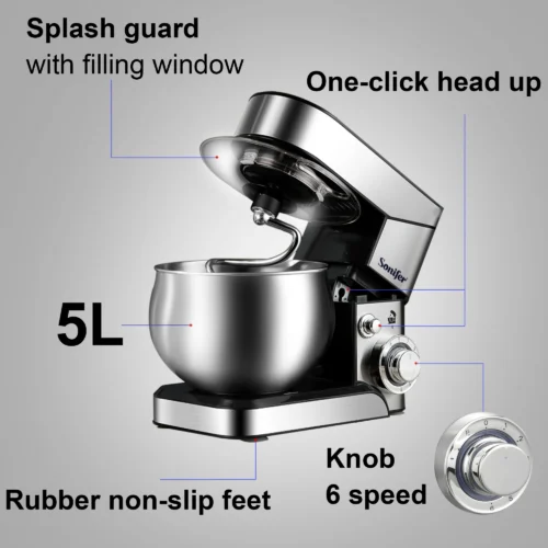 Sonifer 5L Stand Mixer with Stainless Steel Bowl for Baking and Food Preparation
