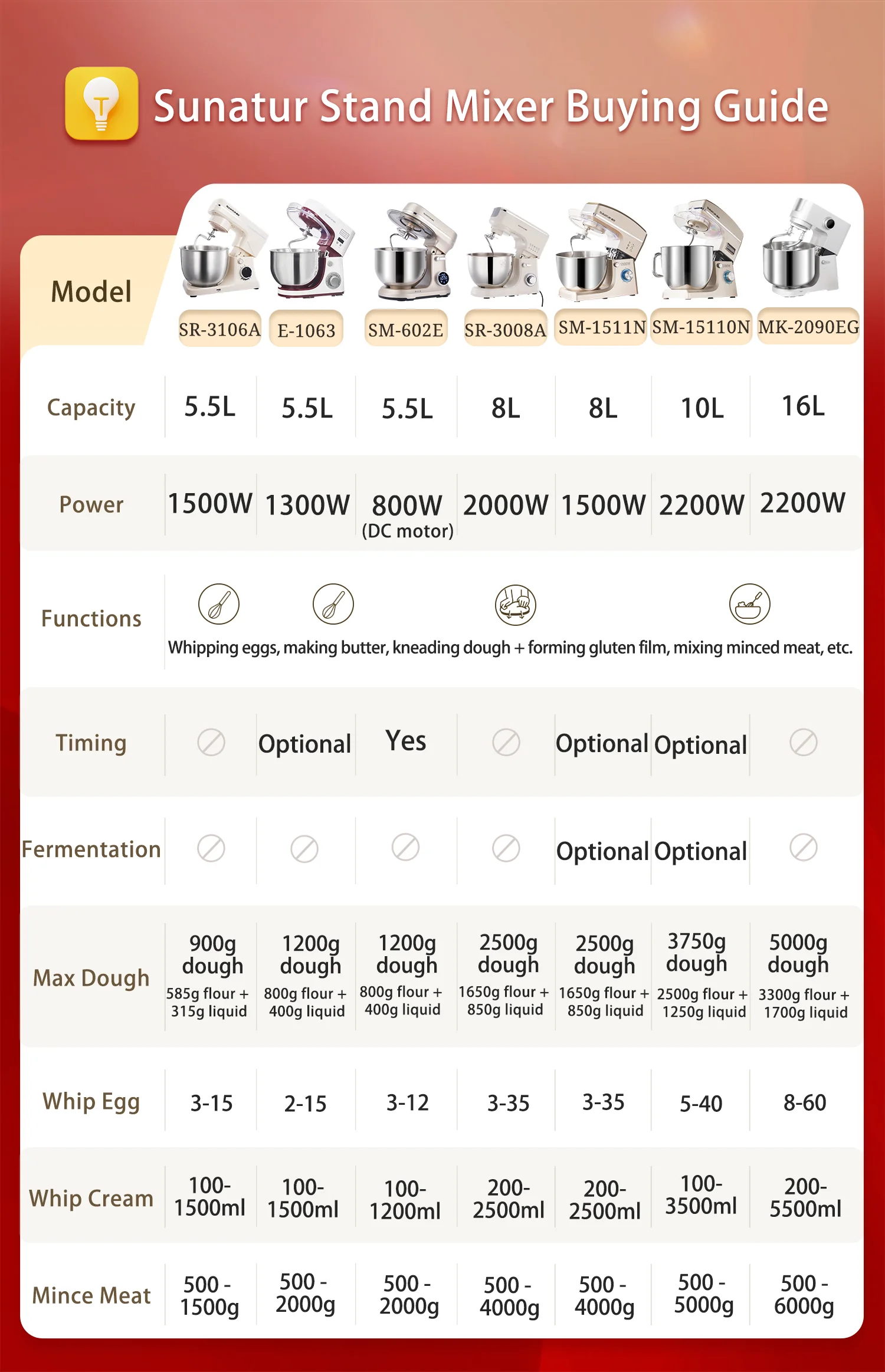 SUNATUR 5.5L Stand Mixer – 1300W Planetary Food Processor with Timer and Dough Kneader
