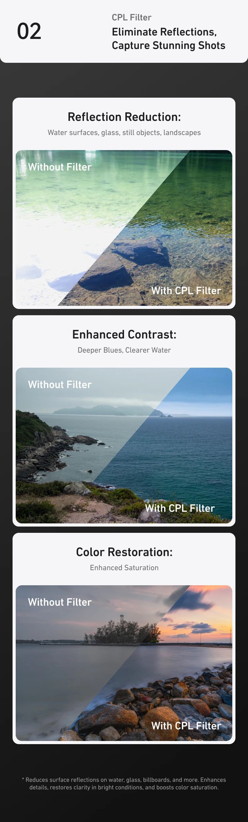 ✨ Reflection-Free Shots: CPL enhances water/glass clarity.
