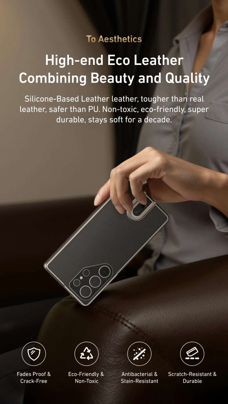 Eco Leather Grip: Silicone-based leather – antibacterial, scratch-resistant, and stays soft for years.