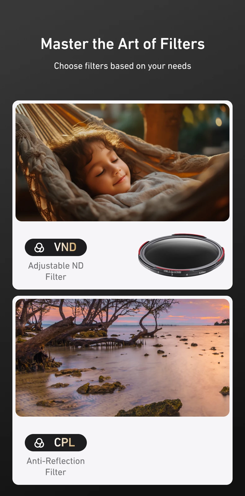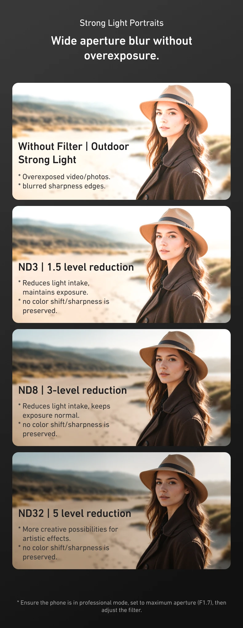 ✨ Perfect for Strong Light: ND filters prevent overexposure in sunlight.