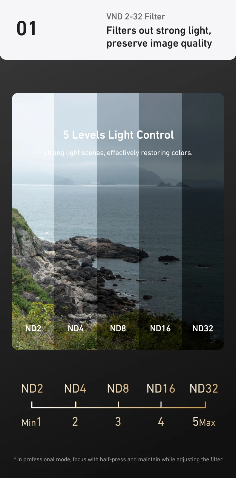 VND Filter (2-32): 5-stop light control to eliminate overexposure in bright scenes.