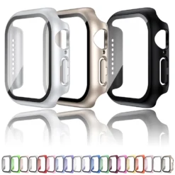 – Tempered glass screen protector and case compatible with various Apple Watch models.