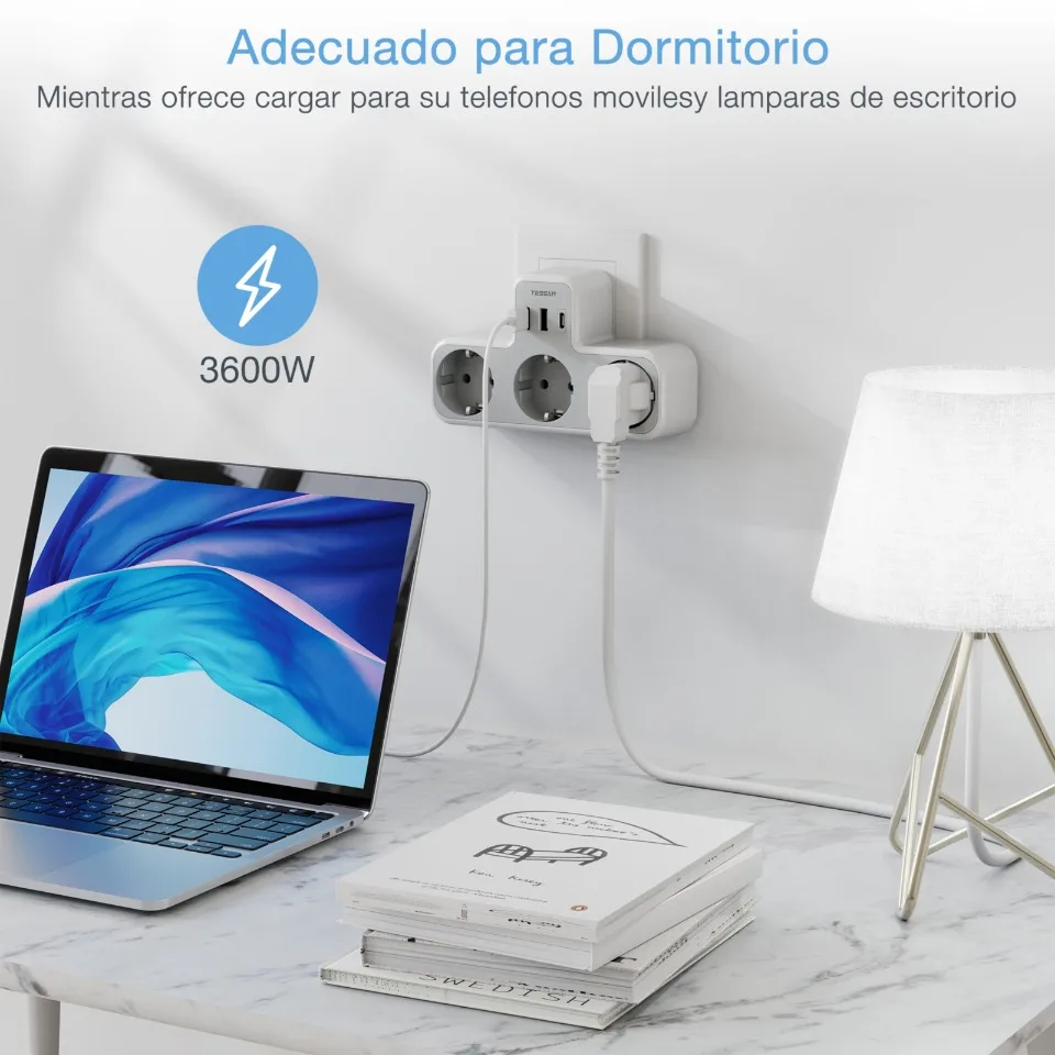 Multiple Wall Outlet equipped with 3 AC ports (3600W), can charge 3 devices simultaneously to meet your charging needs; 3-outlet power strip can be used in any interior, especially in bedrooms.