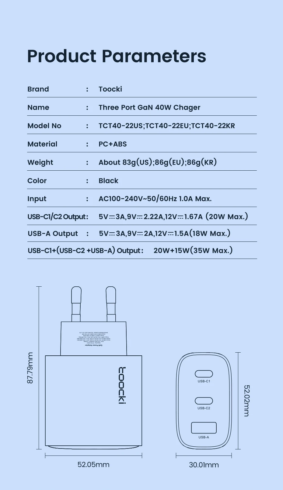 Toocki 40W GaN Dual USB-C Fast Charger for iPhone and Samsung