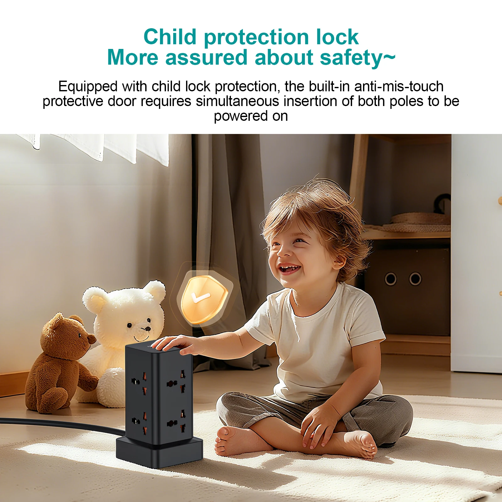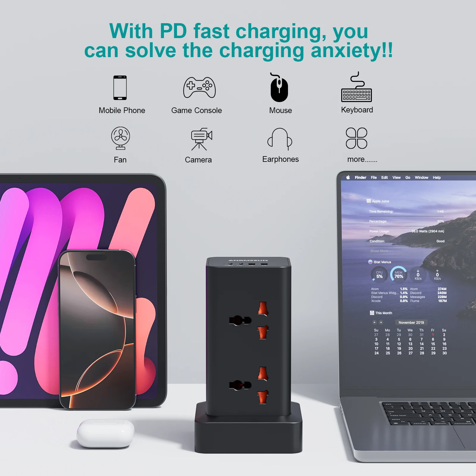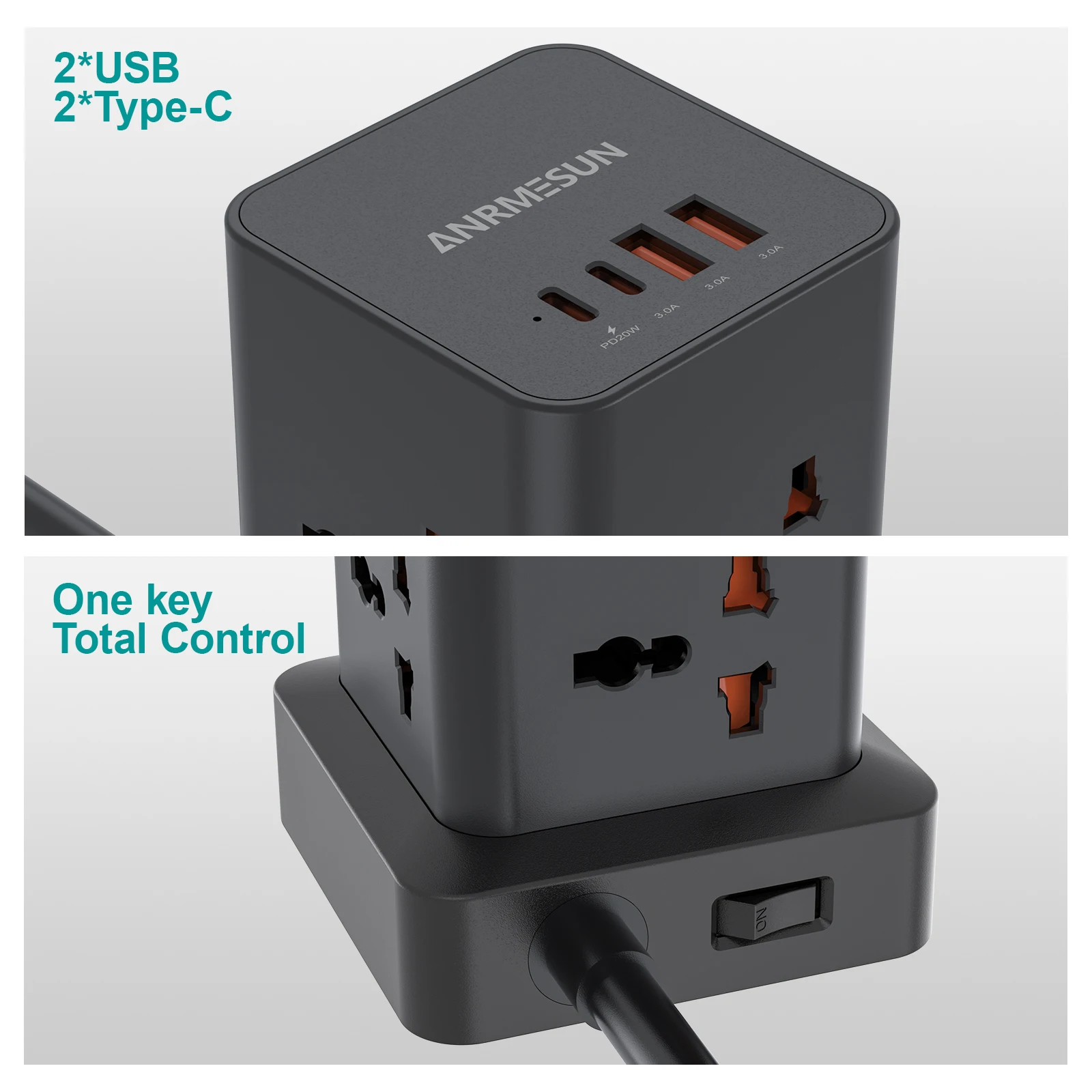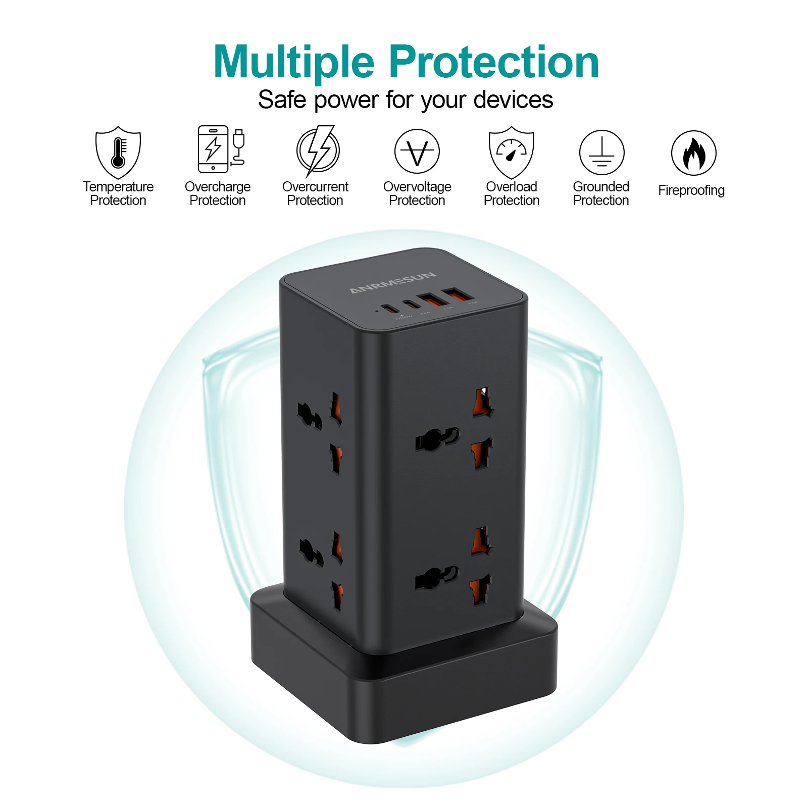 – The ANRMESUN Tower Power Strip is a vertical extension socket with universal outlets, USB and Type-C ports, and surge protection.