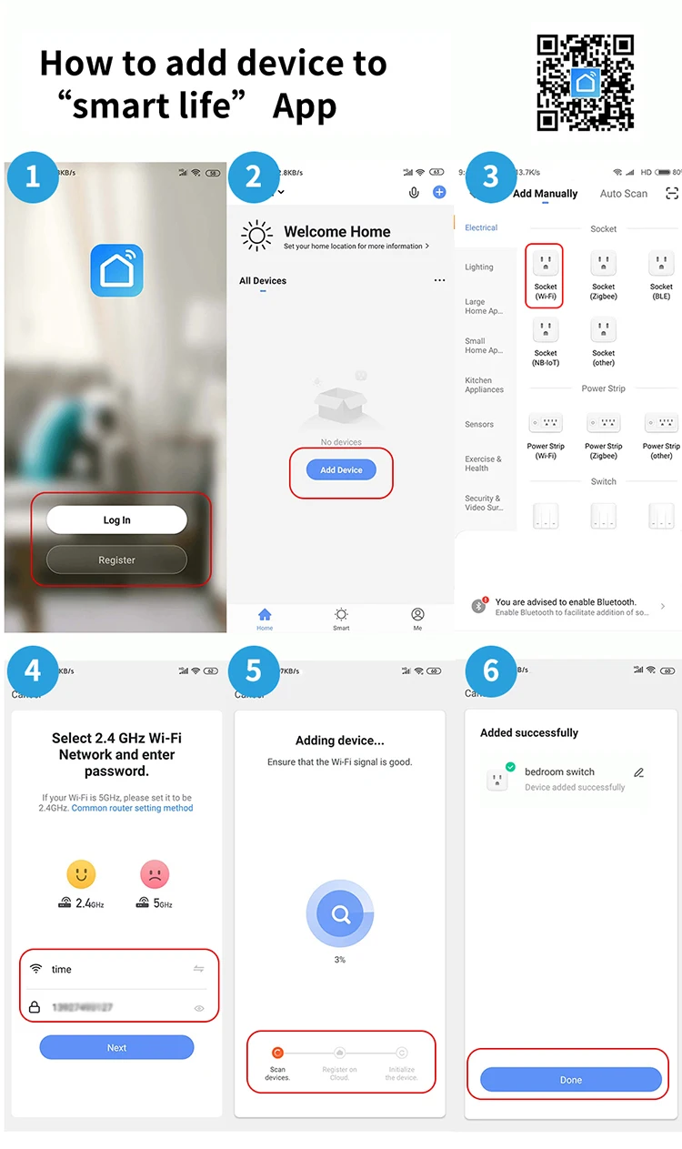 Step 1: Search “Smart Life or TuyaSmart” on APP store, Google Play or scan the QR code on user manual to download and install it.