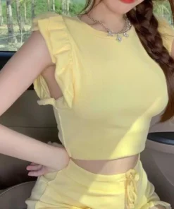 Two Piece Set for Women with Ruffles and Drawstring Shorts in Korean Style