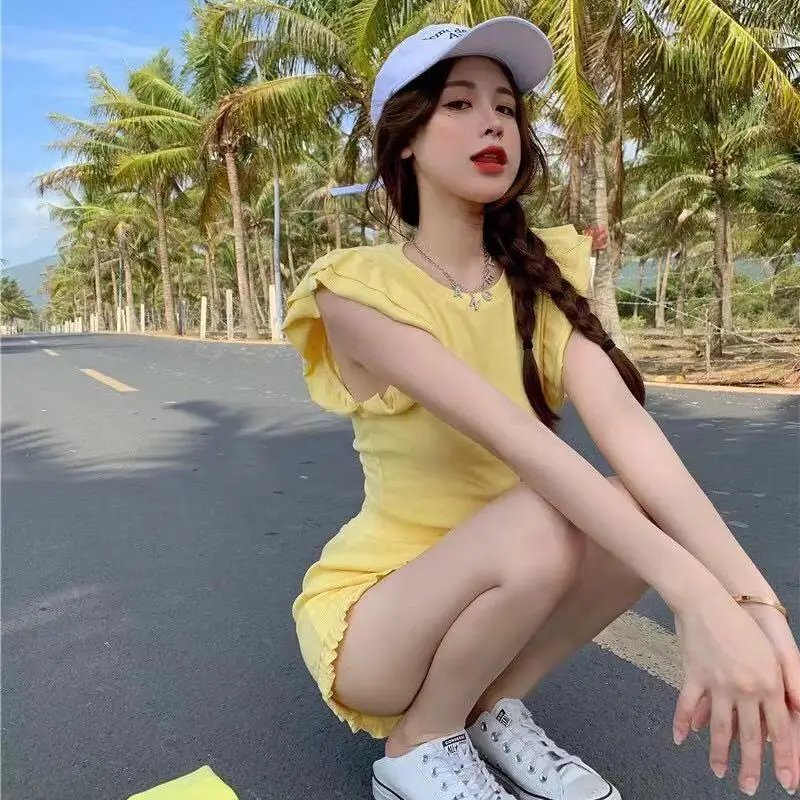 Two Piece Set for Women with Ruffles and Drawstring Shorts in Korean Style