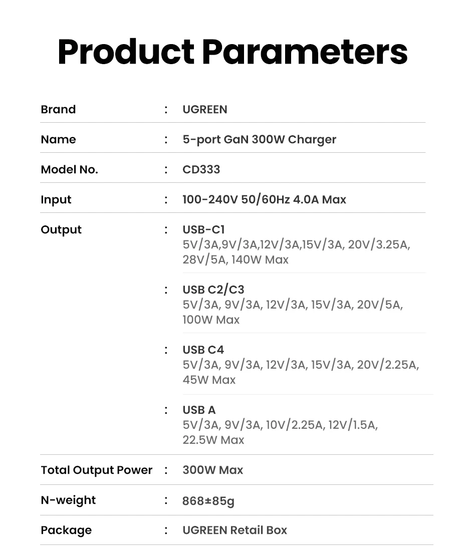 | Plug Type | EU GaN 300W, KR GaN 300W, UK GaN 300W, US GaN 300W |