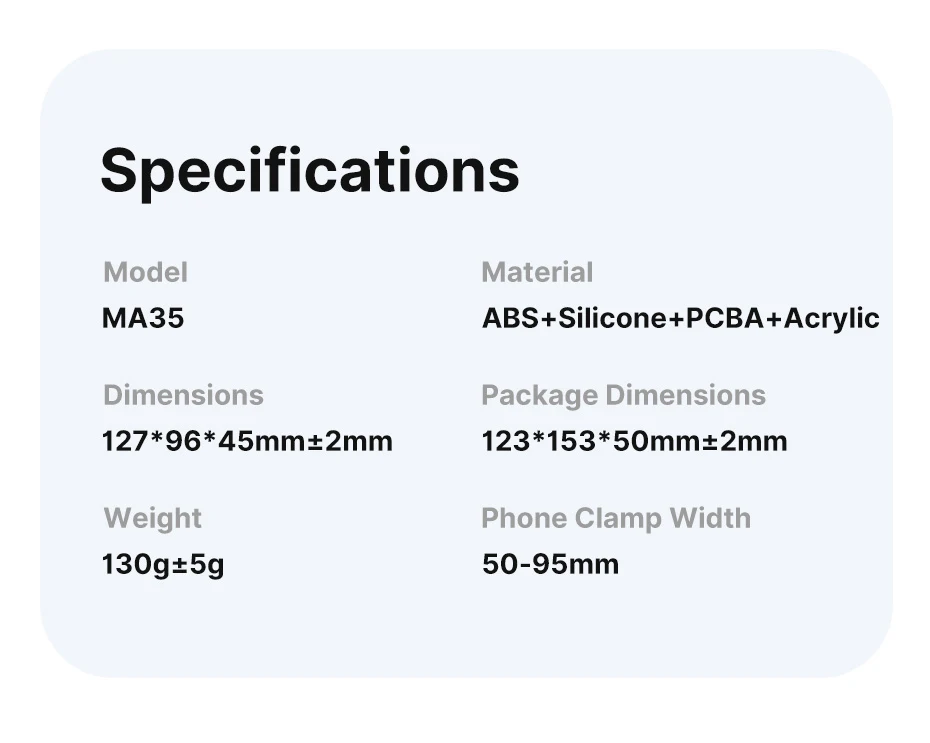 2.Magnetic or Phone Clamp Connection: The MA35 Grip magnetic accessories feature a secure magnetic connection that easily links together, allowing you to customize your workflow on-the-go. This seamless connection enhances your experience and provides a versatile platform for your MagSafe-compatible devices. Phone clamp fits devices that are 1.96 to 3.74″ in width.