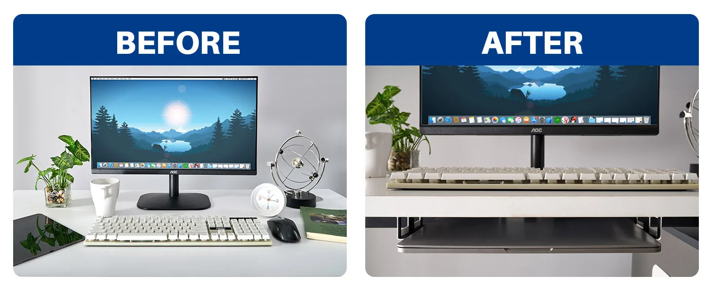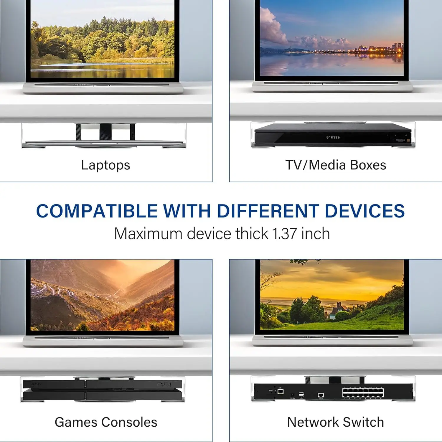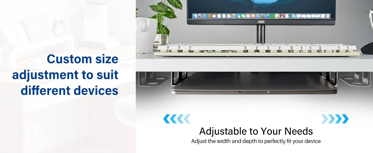 Space Saving: Our laptop stand sits under the table, saving valuable desktop space and bringing you great convenience. It not only supports laptops, but also suitable for devices up to 1.37 inches thick. for Macbook, laptops, Mac Mini, cable boxes, modems, smart TV boxes and more. It can effectively save space, keep leg room and prevent your legs from being impacted! It also keeps your desktop environment cleaner and more organized