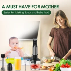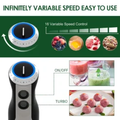 – Wancle immersion hand blender features 16 variable speeds and multiple attachments for versatile kitchen tasks.