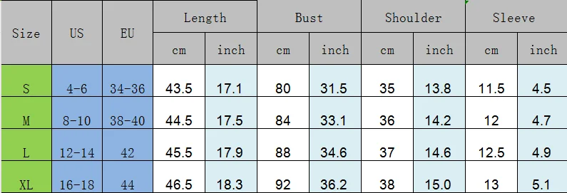 XL Length: 18.3 Bust: 36.2 Shoulder: 15.0 Sleeve: 5.1