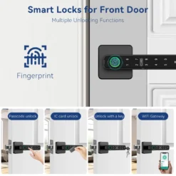 – 4-in-1 door lock with fingerprint, password, mobile app, and two keys.