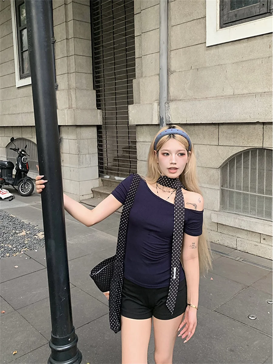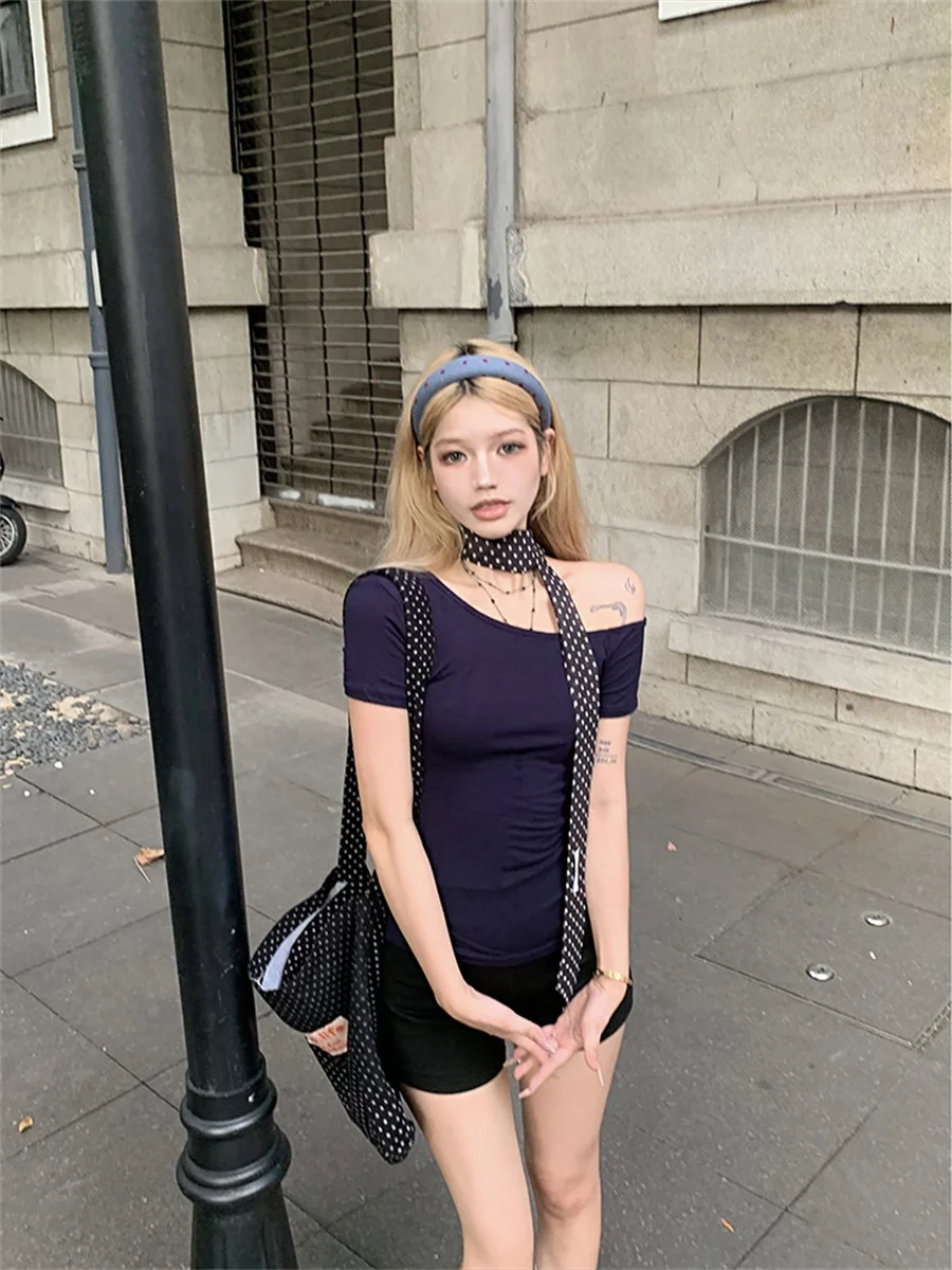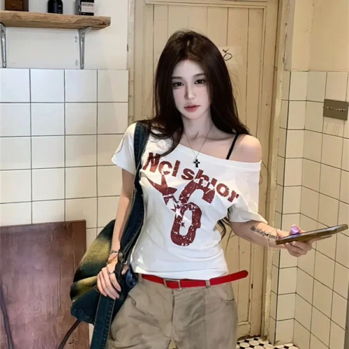 Y2k Sport Summer Off shoulder Top Women Letter Sexy Vintage 2000s Short sleeve T shirt Lady Body Basic Crop Top Female Casual