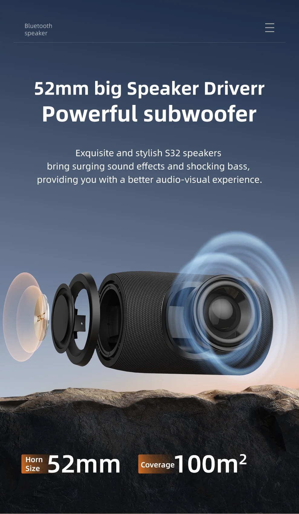 The S32 is equipped with a 57mm full range driver with a total output power of 10W (root mean square), specifically tuned for music, making bass clearer and more transparent.