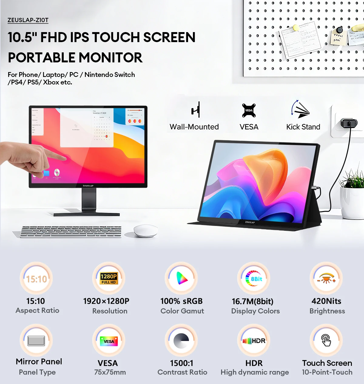 Zeuslap 10.5″ FHD Portable Touchscreen Monitor – 100% sRGB IPS for Switch, PS5, Raspberry Pi, and Laptops
